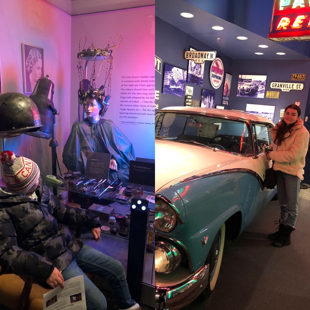 Museum entrance Nick testing out the hairdresser and Annie by the 50s Fairlane