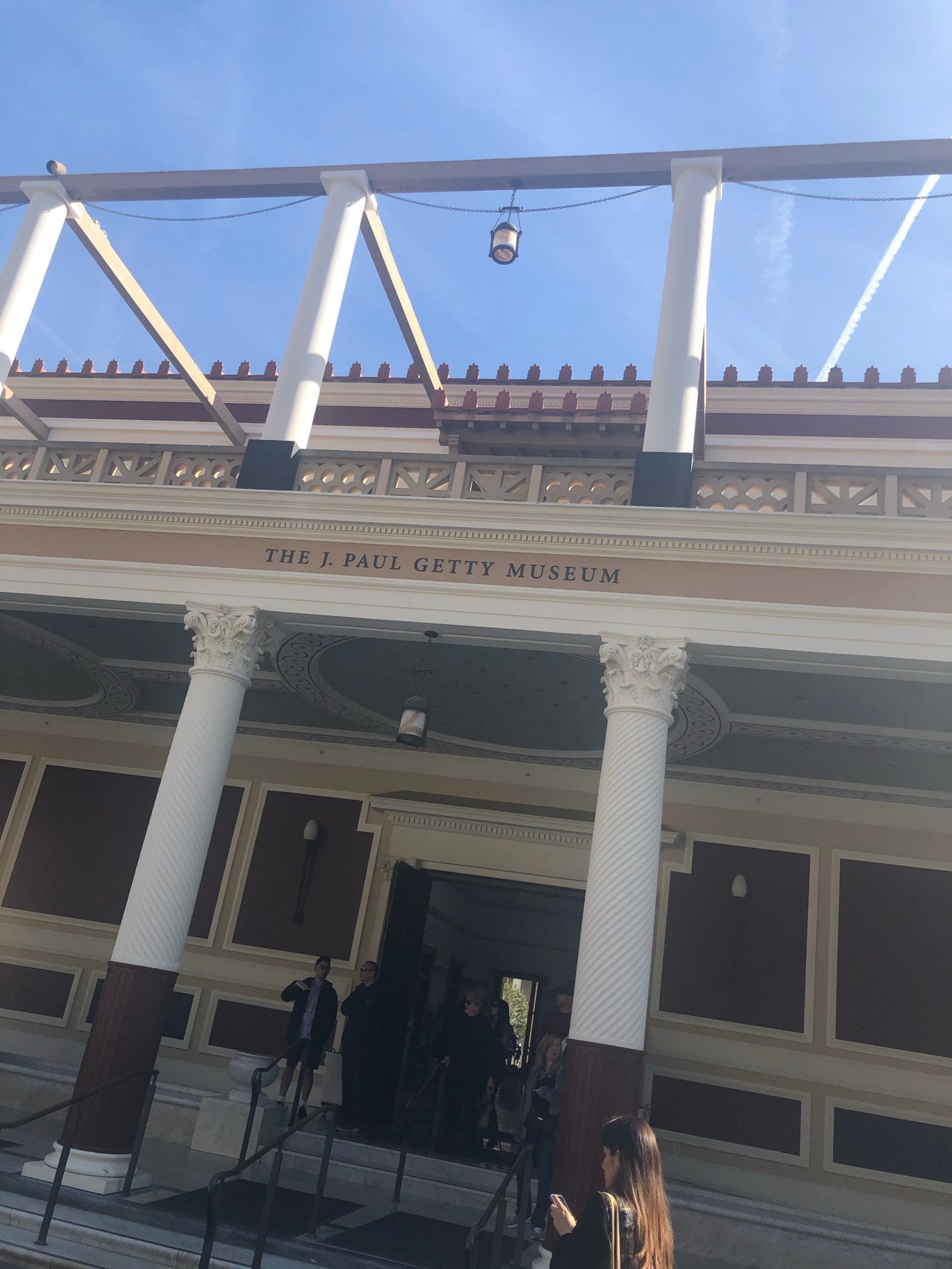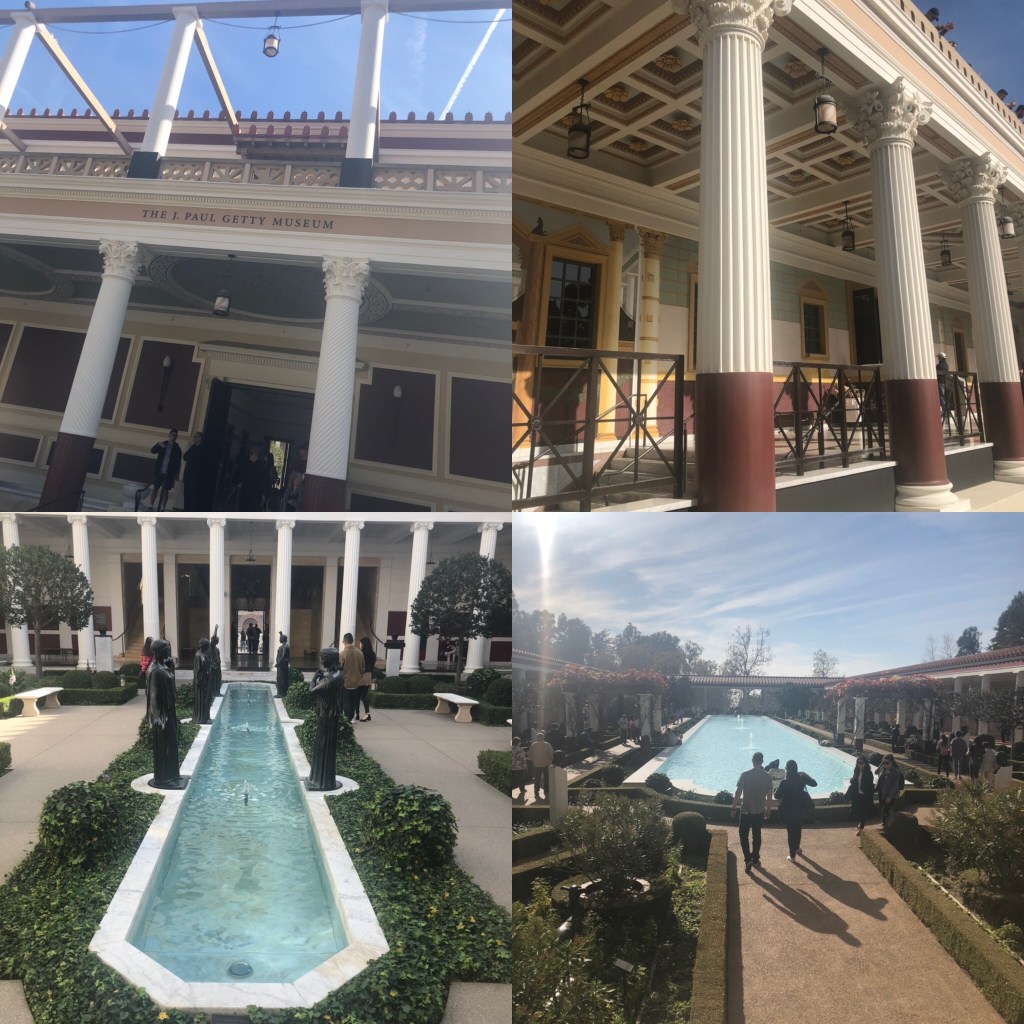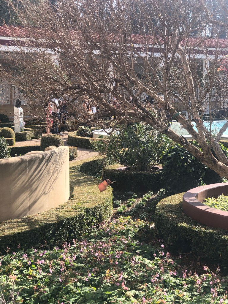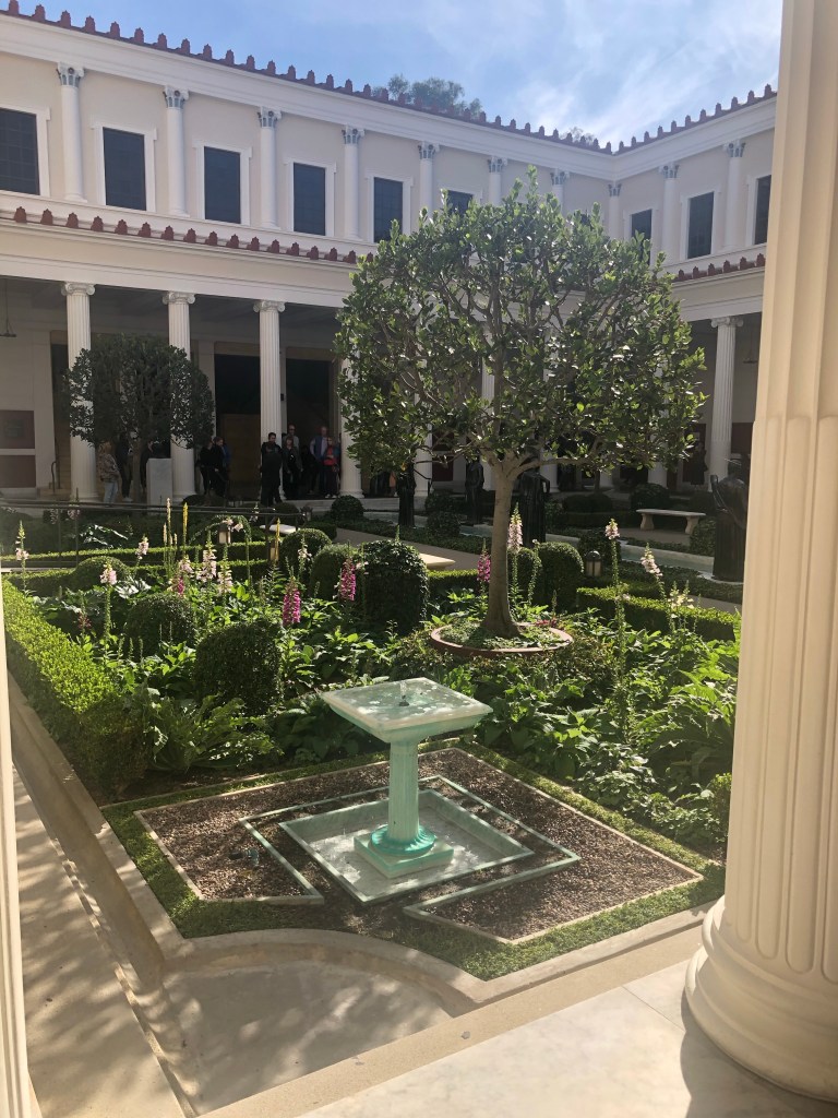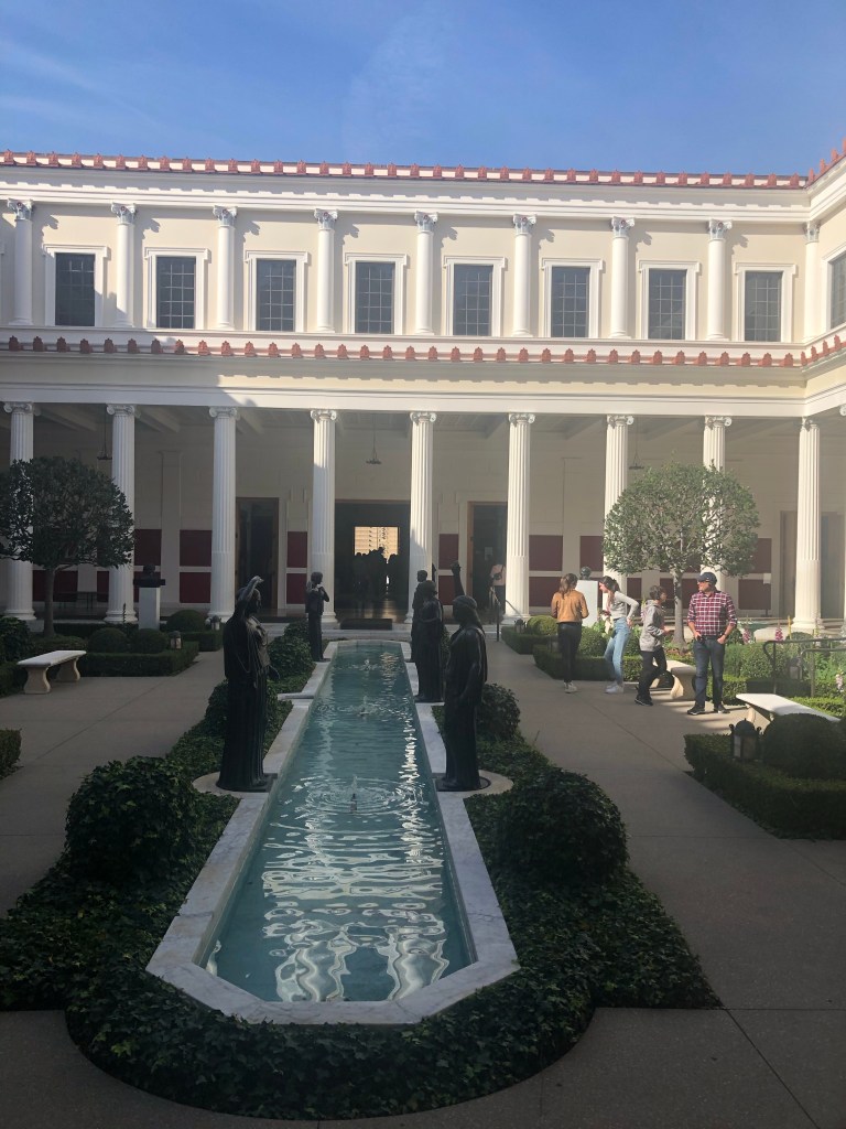 We enjoyed the included breakfast at the hotel, packed up and headed for the Getty Villa (I booked ahead this time!) … about 1.5 hrs drive from Santa Barbara. The Villa is a recreation of an ancient Roman country house – J. Paul Getty had it built as a replica of Villa dei Papiri. When planning for the construction of the Getty Villa in the 1970s, architects looked closely at the partial excavation of the Villa dei Papiri and at other ancient Roman houses in Pompeii, Herculaneum, and Stabiae to influence the design. The scale, appearance, and some of the materials of the Getty Villa are taken from the Villa dei Papiri, as is the floor plan, though it is a mirror of the original.