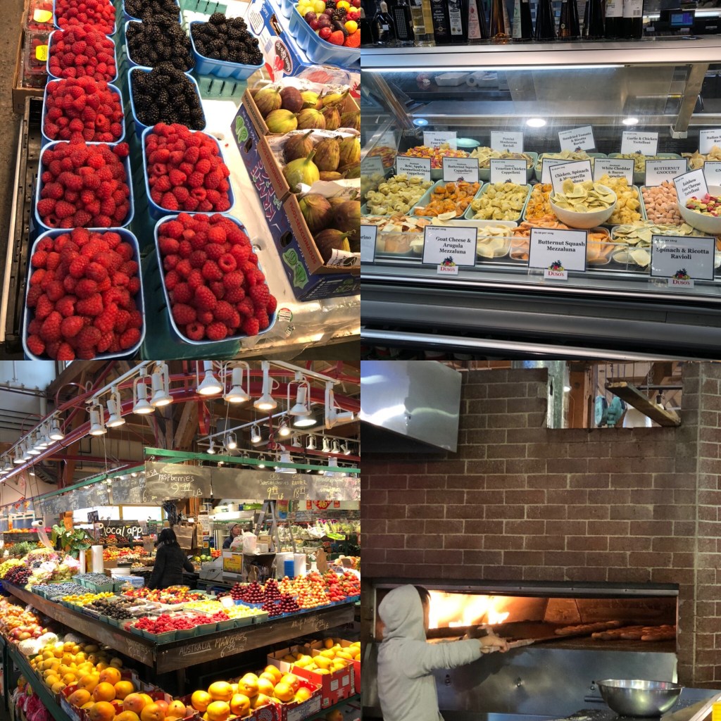 So unusual to see snow by the sea!Fresh fruit and vege, handmade pasta, and the bottom shot is bagels cooking !