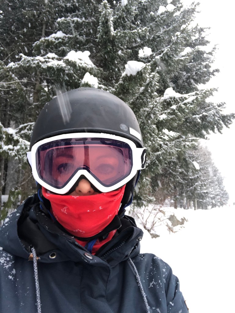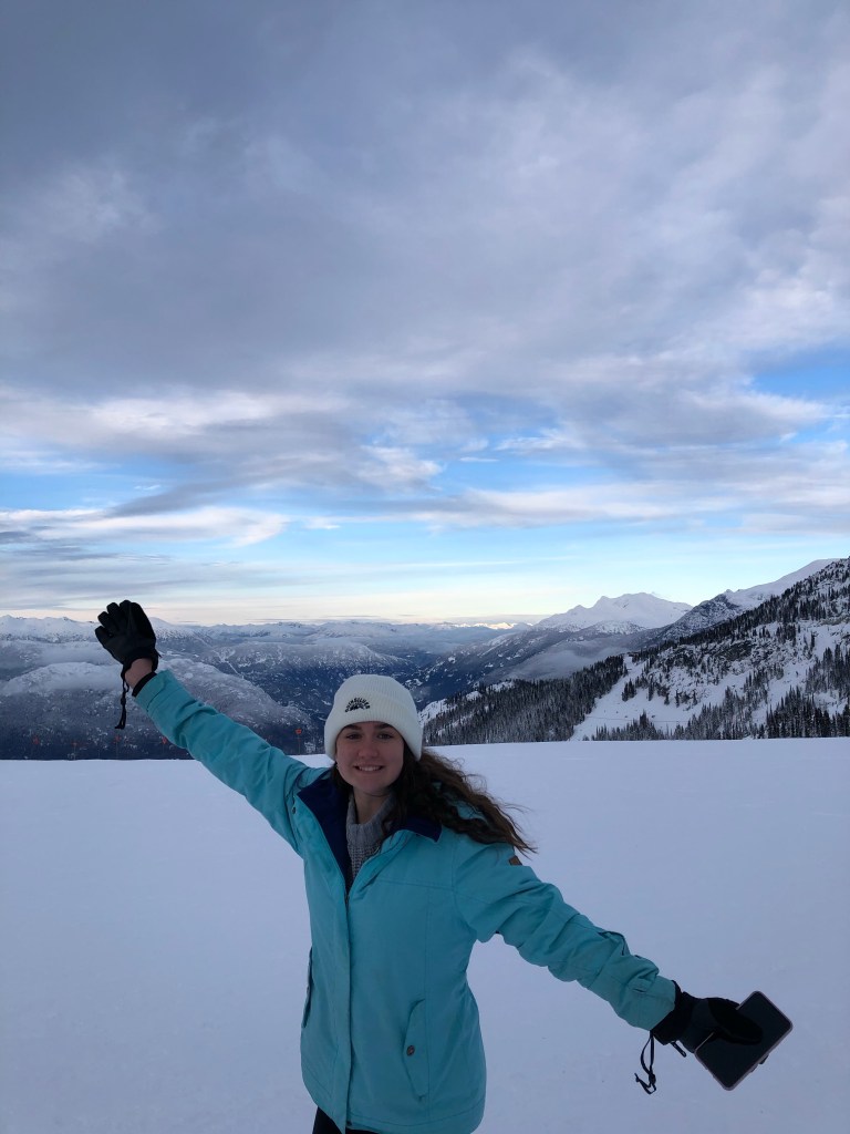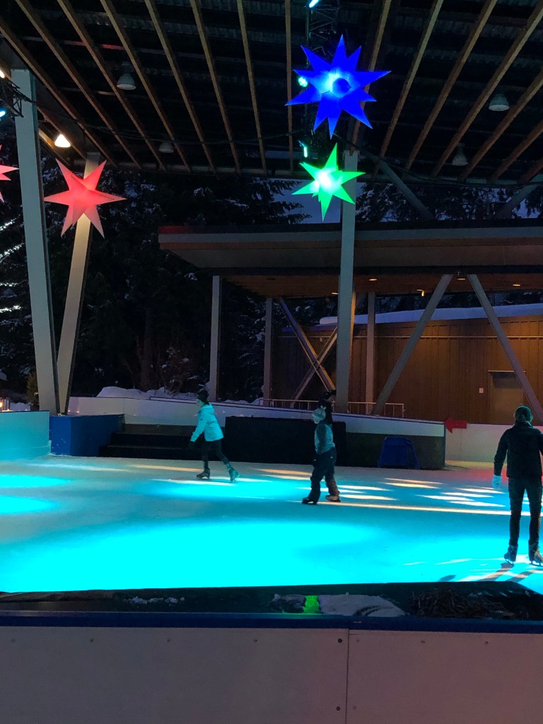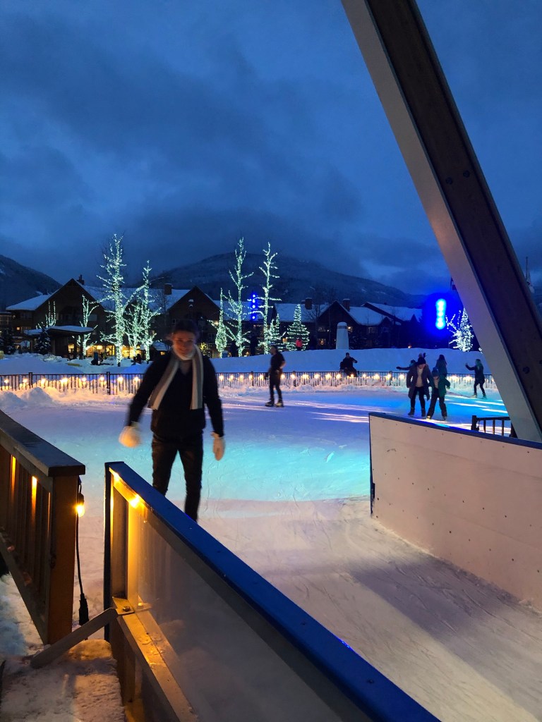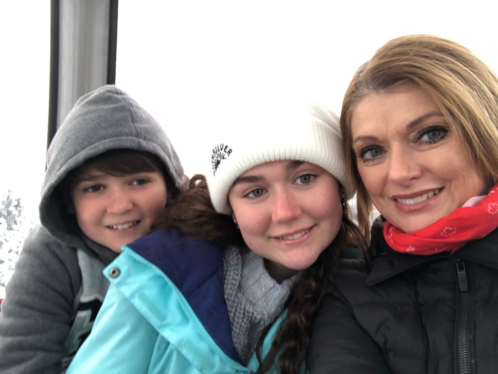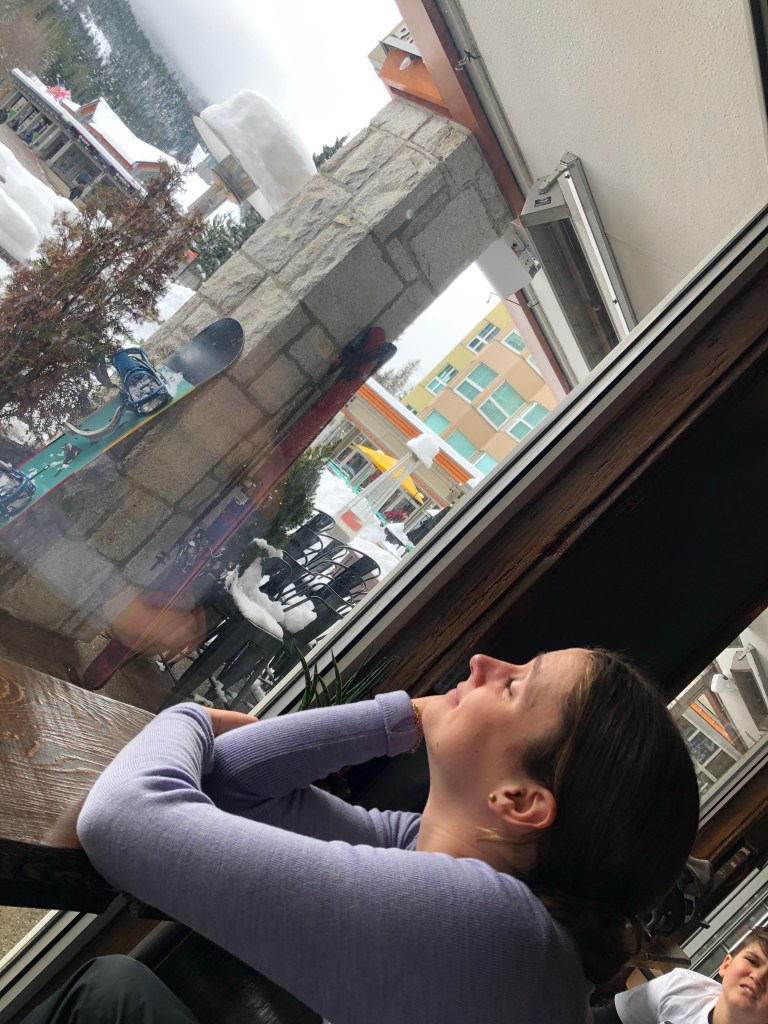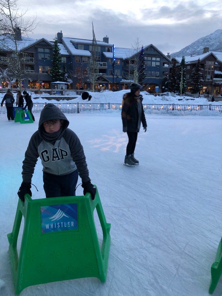 Annie ⛸ Nick trying to skate … pushing a Zimmer frame around: but he was much improved when it did it again yesterday!View from the top of Blackcomb MountainGondola buddies! Annie! Me ready for skiing ⛷ Cate taking a break – she is absolutely loving the skiing – and is really good at it!