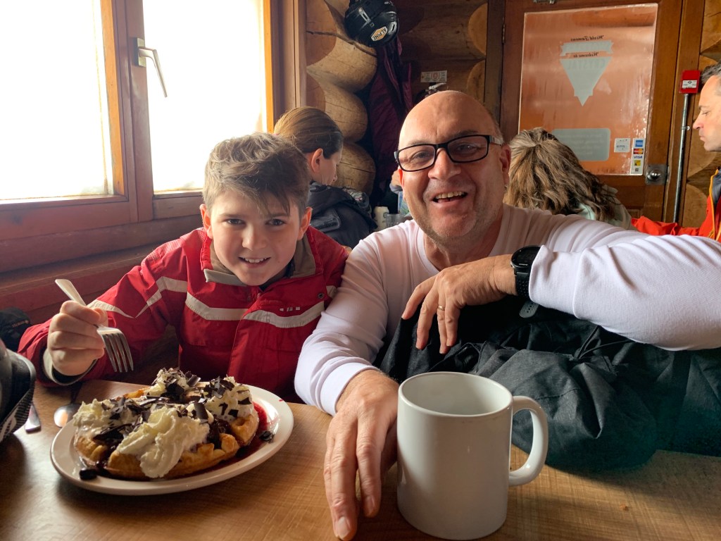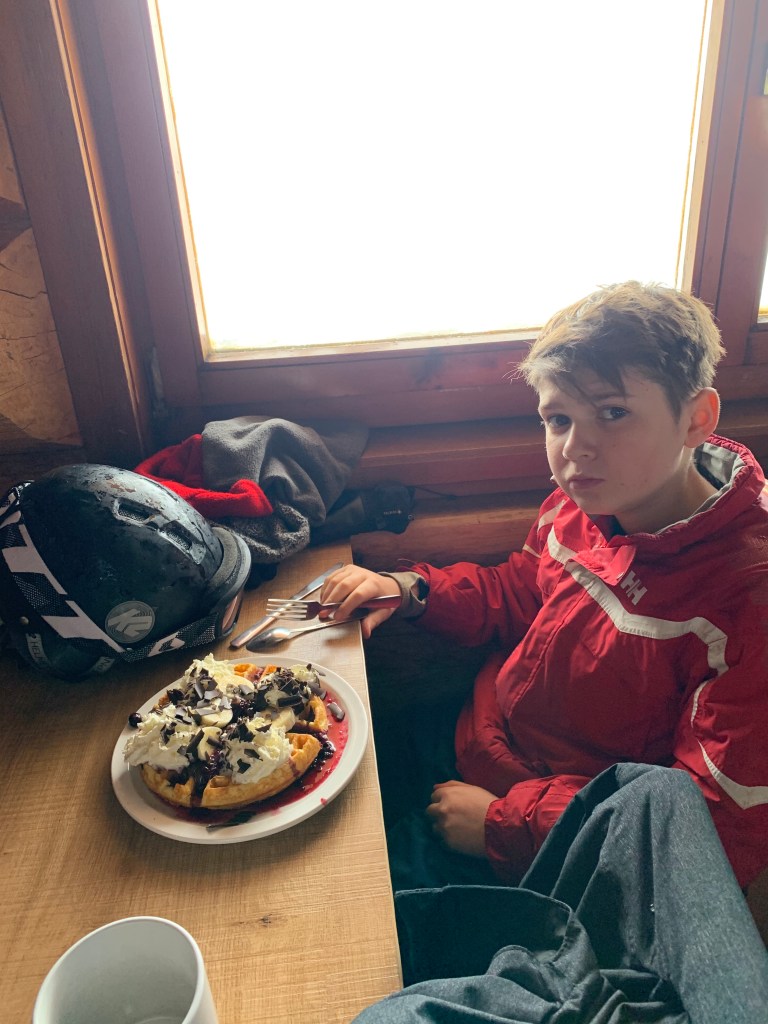 Once we finished, I walked back to the villa – no mean feat as it involved walking up the ski slope! – to get my skis and then we all met up at our favourite cafe down the bottom for lunch – great flatbreads, burgers, wraps and salads.